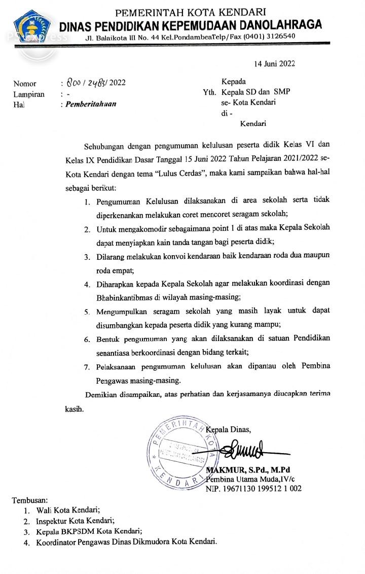 Melalui surat edarannya, Dikmudora Kota Kendari, tertanggal 14 Juni 2022, Nomor Surat: 800/ 2483/ 2022, yang ditandatangani Kadis Dikmudora, Makmur, S.Pd., M.Pd, ditujukan kepada seluruh Kepala SD dan SMP se-Kota Kendari, menyampaikan hal-hal sebagai berikut: