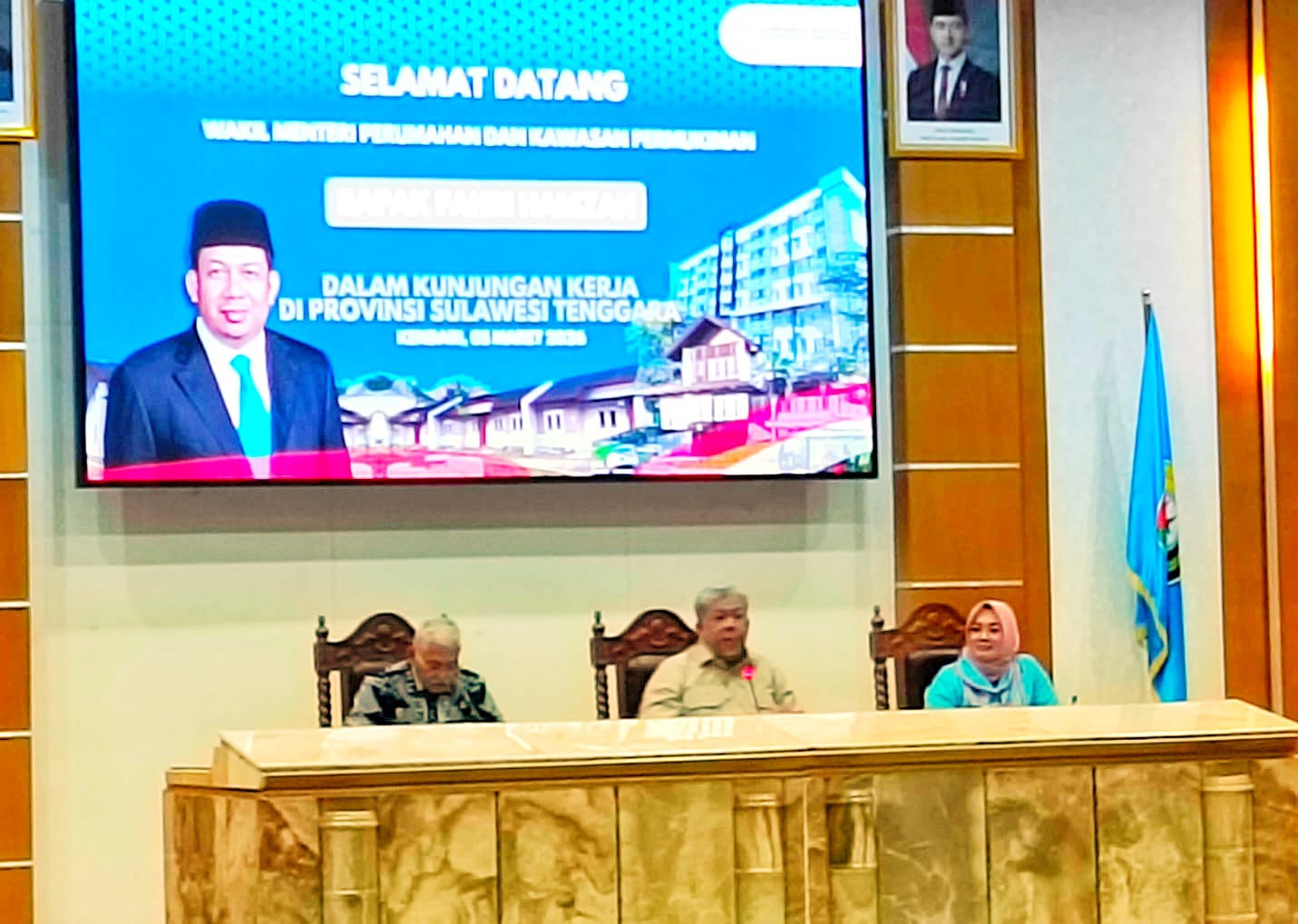 Kendari – Wali Kota Kendari, Siska Karina Imran, memaparkan kondisi perumahan dan strategi penanganan kawasan kumuh di Kota Kendari saat menerima kunjungan kerja Wakil Menteri Perumahan dan Kawasan Permukiman, Fahri Hamzah, di Ruang Pola Kantor Gubernur Sulawesi Tenggara, Kamis (5/3/2026).
