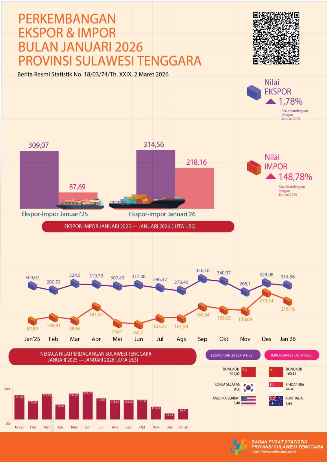 Sementara itu, dari sisi impor, BPS Sultra mencatat lonjakan yang cukup signifikan. Nilai impor Sultra pada Januari 2026 mencapai USD218,16 juta atau naik 148,78 persen dibandingkan periode yang sama tahun sebelumnya.