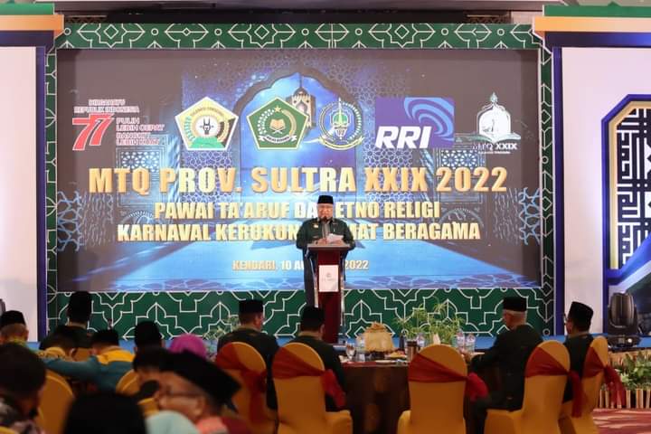 MNC Trijaya Kendari – Gubernur Sulawesi Tenggara (Sultra) Ali Mazi, menghadiri sekaligus membuka Musabaqah Tilawatil Quran (MTQ) ke-XXIX (29) tingkat Prov. Sultra, dengan tema “MTQ Nusantara, Merdeka Bertoleransi, Bersahabat, Bermartabat, Menyongsong 77 Tahun Indonesia Merdeka”. Kegiatan berlangsung di Hotel Claro Kendari, Rabu malam (10/8/2022).