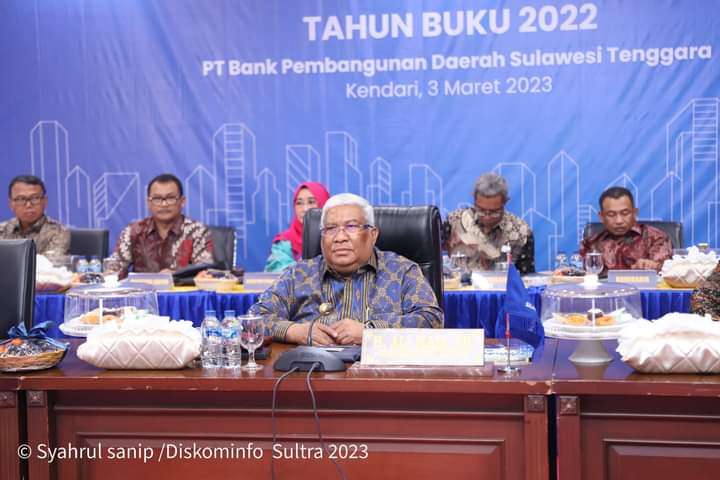 Kendari – Rapat Umum Pemegang Saham (RUPS) tahun buku 2022 dan Rapat Umum Pemegang Saham Luar Biasa (RUPS-LB) PT.Bank Pembangunan Daerah Sulawesi Tenggara (BANK SULTRA) yang dilaksanakan di Aula Merah Putih Rumah Jabatan Gubernur Sultra dibuka Gubernur Provinsi Sulawesi Tenggara Ali Mazi, Jumat (3/3/2023).
