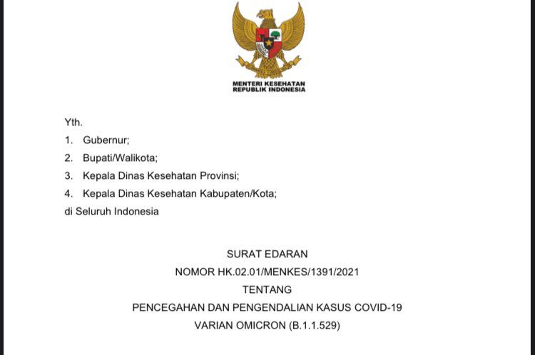 Sebagai bentuk kesiapsiagaan pemerintah dalam mencegah serta mengendalikan penularan varian Omicron. Kementerian Kesehatan menerbitkan Surat Edaran (SE) Nomor HK.02.01/MENKES/1391/2021 tentang Pencegahan dan Pengendalian Kasus COVID-19 Varian Omicron (B.1.1.529) yang ditandatangani Menteri Kesehatan pada 30 Desember 2021.