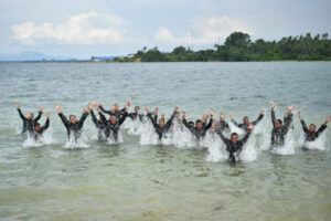 Usai pelaksanaan upacara para personel yang naik pangkat juga mengikuti acara tradisi sederhana yakni mandi air laut bertempat di depan Mako Lanal Kendari.