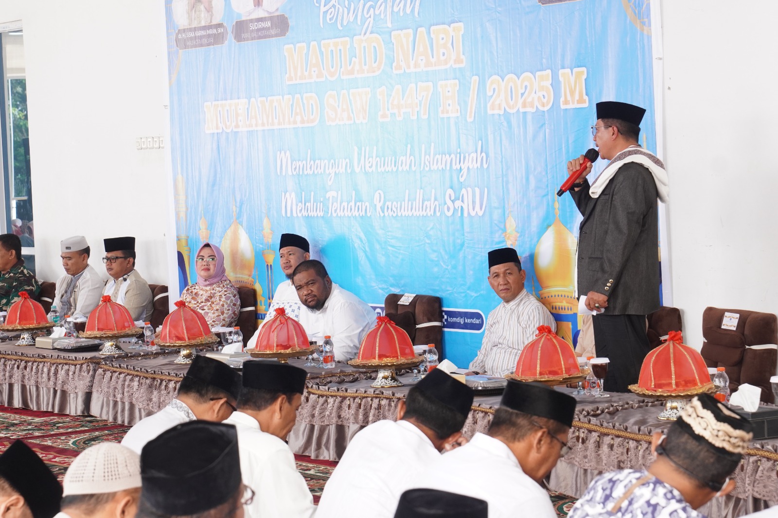 Kendari – Pemerintah Kota Kendari menggelar peringatan Maulid Nabi Muhammad Shallallahu Alaihi Wasallam di selasar lapangan upacara Balai Kota Kendari, Jumat (5/9/2025). Kegiatan ini dihadiri Wali Kota Kendari dr. Siska Karina Imran, Wakil Wali Kota Sudirman, jajaran pejabat pemerintah, tokoh agama, dan masyarakat.