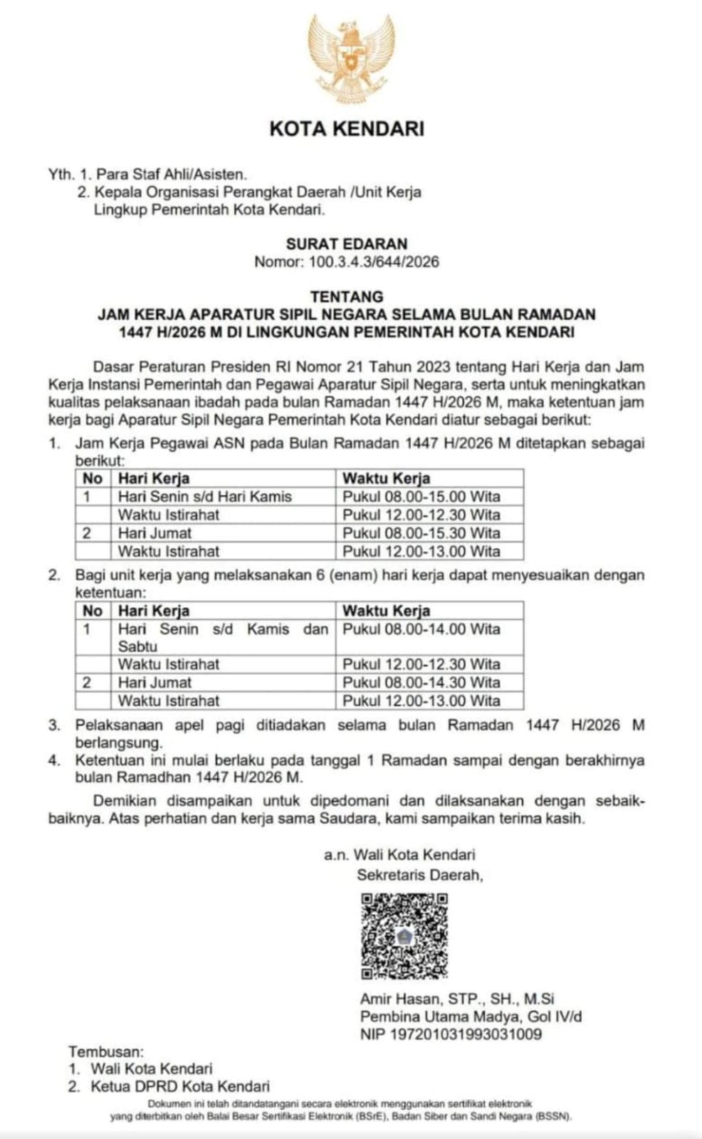 Surat Edaran Terbit, Ini Jadwal Kerja ASN Kendari di Bulan Ramadan 1447 H